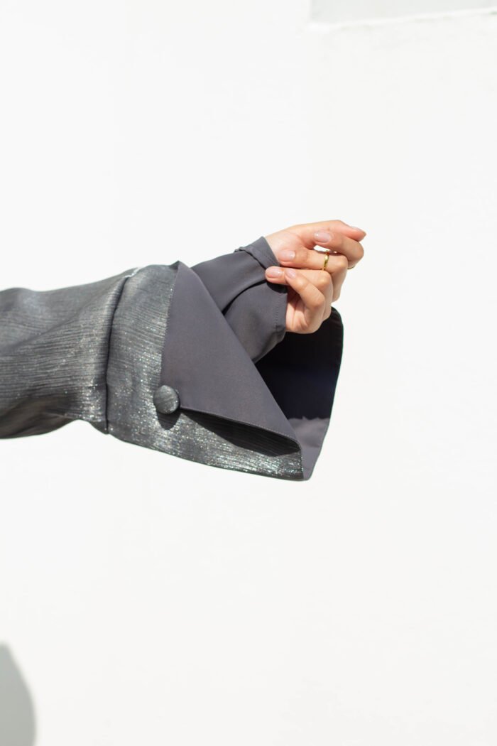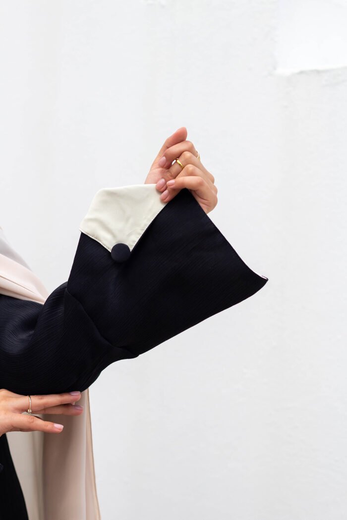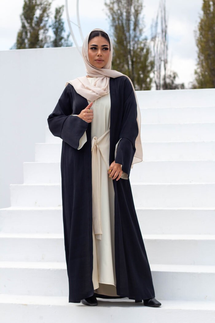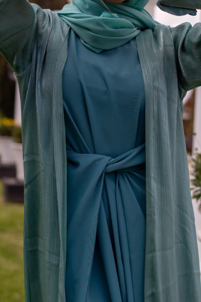 This design features a luxurious and contemporary look, crafted from a shimmering, textured fabric that elevates modest fashion. The flowing silhouette exudes sophistication, while the bell sleeves with elegant buttoned cuffs add a refined touch. The lightweight material offers movement and grace, making it ideal for both casual and formal occasions. Available in a range of soft, muted tones with a subtle sheen, this abaya is perfect for those who appreciate understated glamour. Whether styled with a matching belt for a structured fit or left open for a relaxed drape, this piece embodies elegance and versatility.