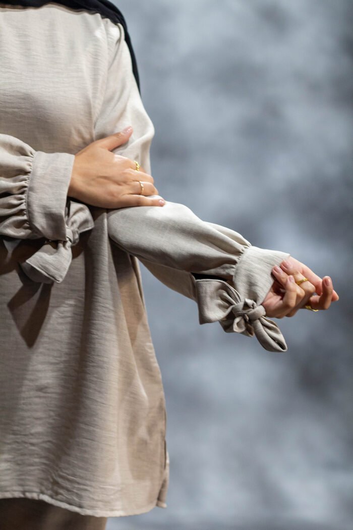 The Sandrift Co-Ord Set is where graceful design meets thoughtful comfort. Tailored in breathable Besiktos fabric, this set feels weightless and works beautifully across seasons. The tunic flows effortlessly, accented with gathered sleeves and distinctive tie-cuff detailing for a soft, feminine touch. Side slits and discreet pockets add practicality without compromising on modesty.
