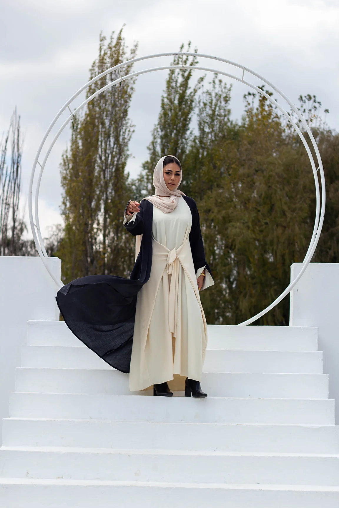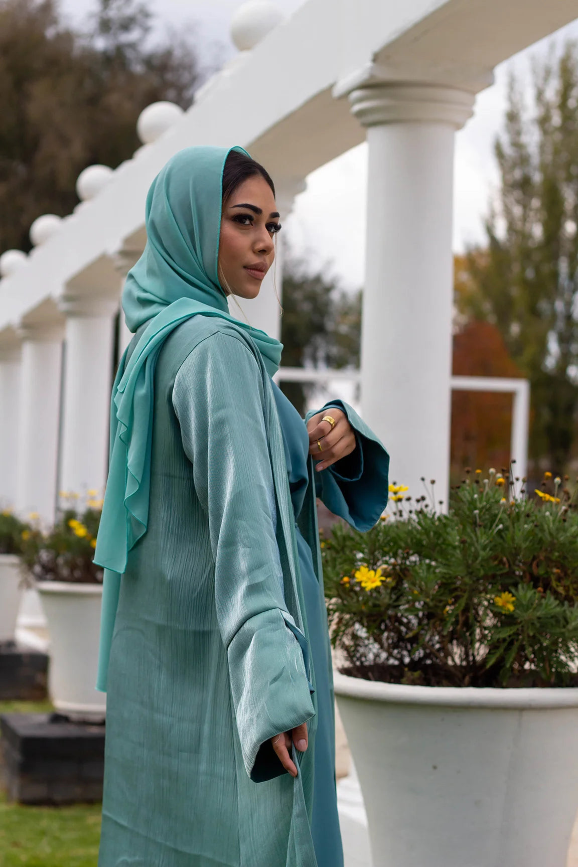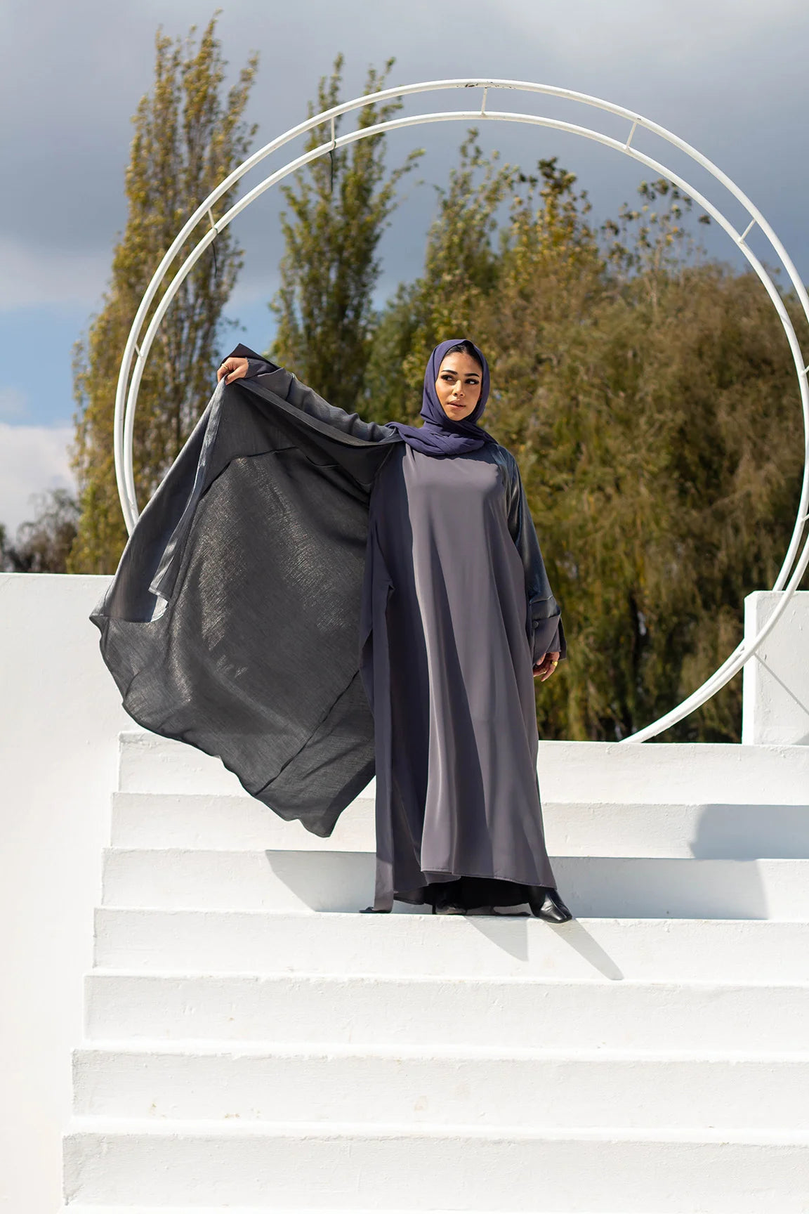 This design features a luxurious and contemporary look, crafted from a shimmering, textured fabric that elevates modest fashion. The flowing silhouette exudes sophistication, while the bell sleeves with elegant buttoned cuffs add a refined touch. The lightweight material offers movement and grace, making it ideal for both casual and formal occasions. Available in a range of soft, muted tones with a subtle sheen, this abaya is perfect for those who appreciate understated glamour. Whether styled with a matching belt for a structured fit or left open for a relaxed drape, this piece embodies elegance and versatility.