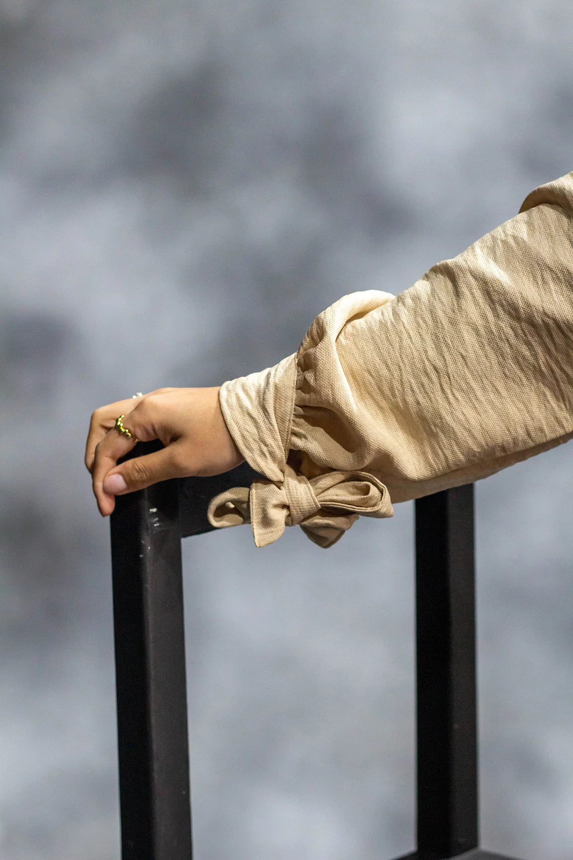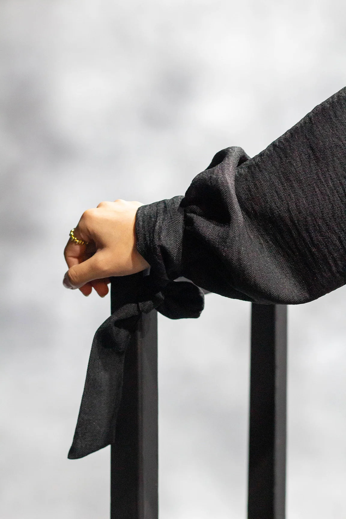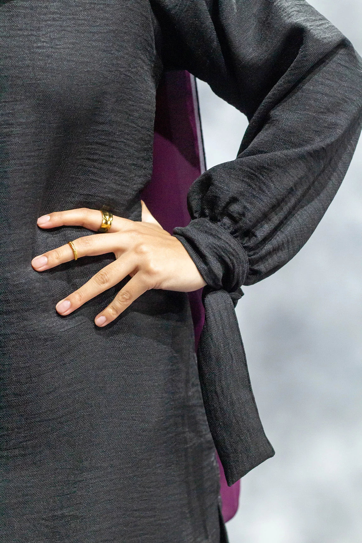 Design: Tie-cuffed balloon sleeves, side pockets, side slits