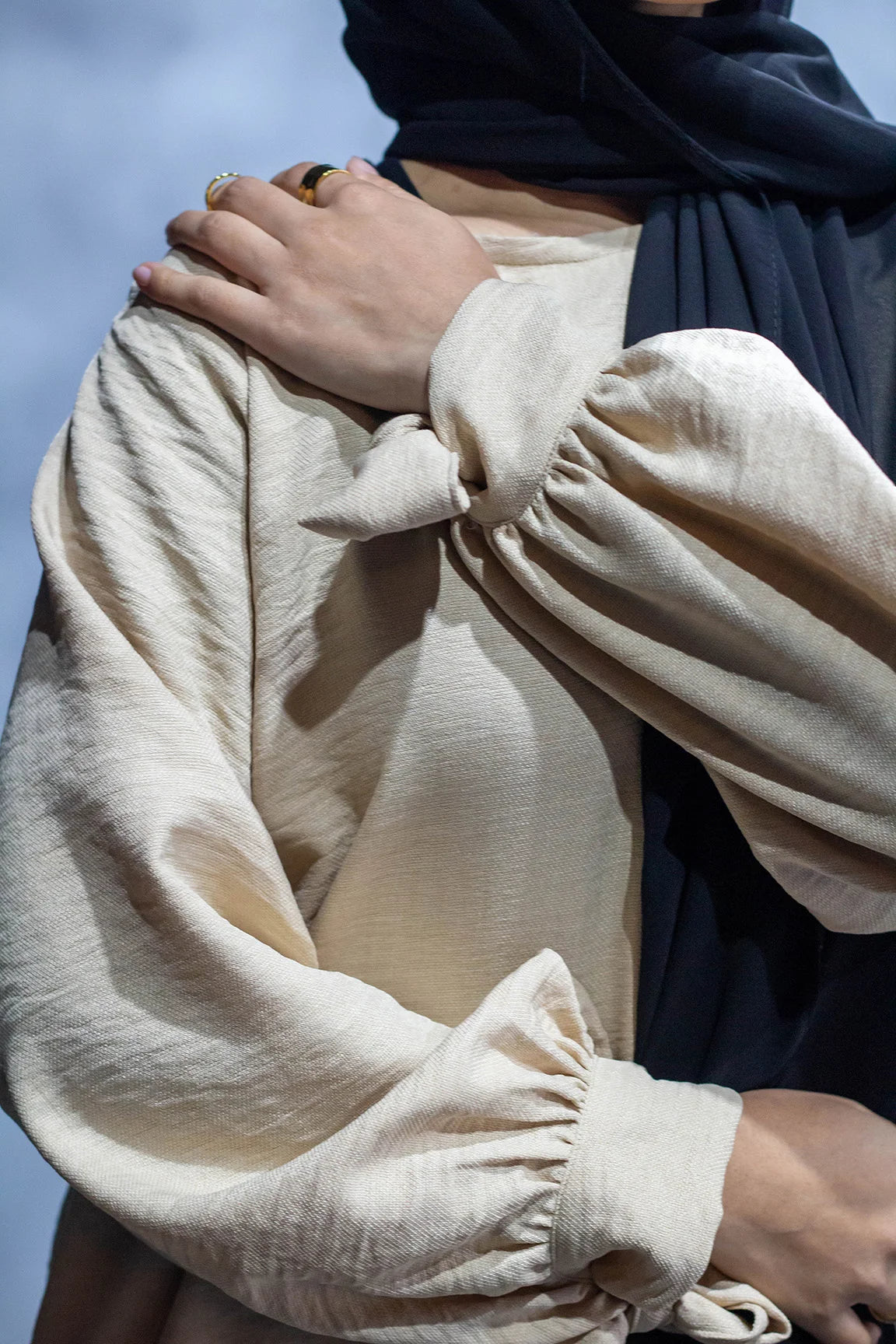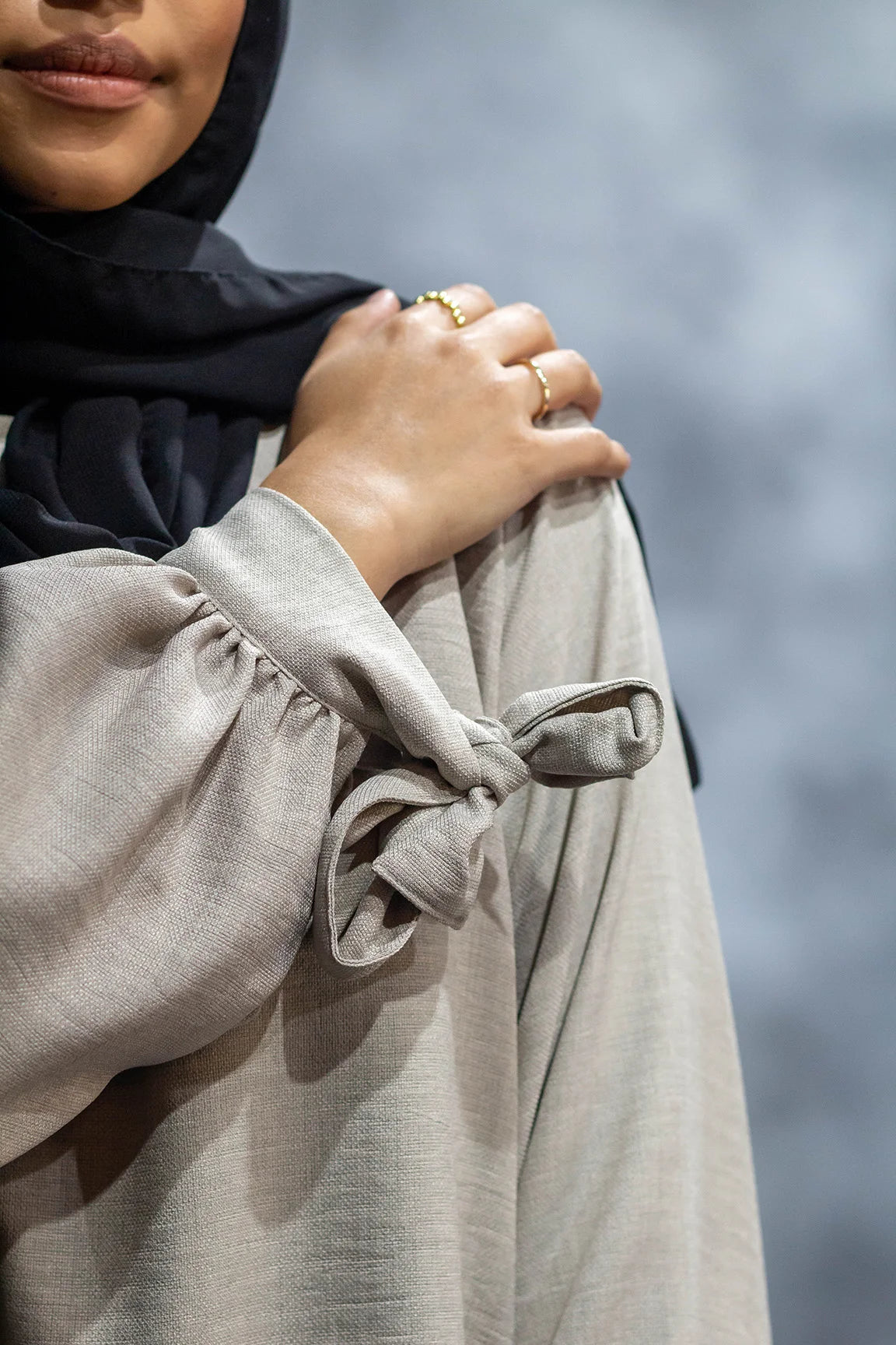 Airy comfort meets everyday elegance. A versatile two-piece in feather-light Besiktos fabric, designed for modest ease and style. Features tie-cuffed sleeves, side pockets, and modest-fit trousers. Scarf not included.